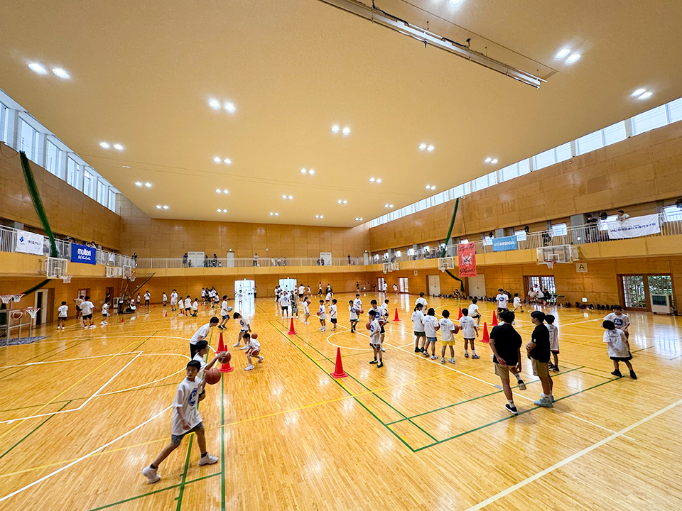 今回は、近藤 崚太選手(香川ファイブアローズ) 石川 晴道選手(岩手ビッグブルズ) 岡島 和真選手(山形ワイヴァンズ)のBリーガー3名と約60名の小中学生にご参加いただきました。